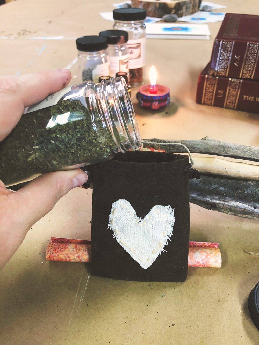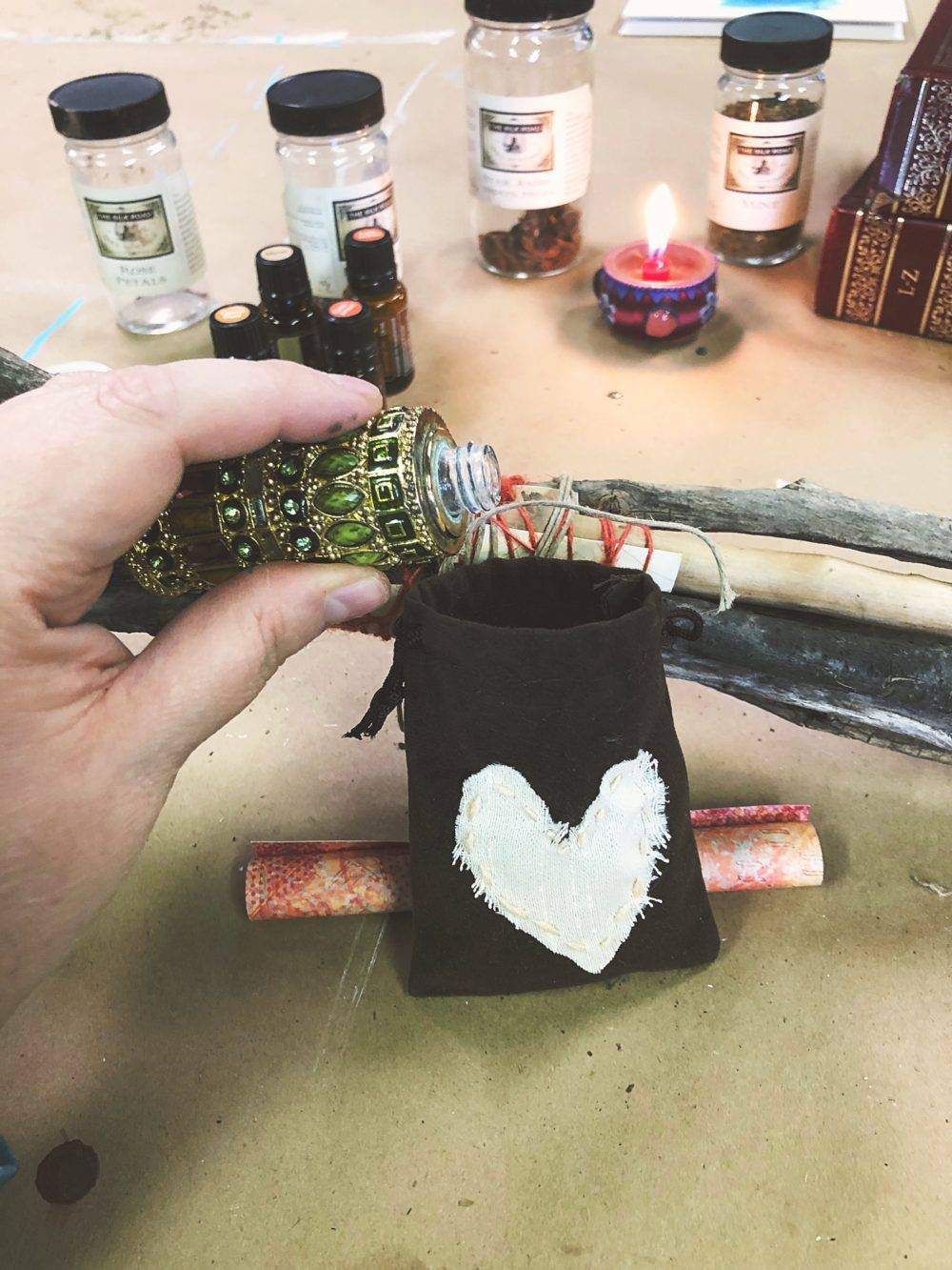 - Fill the prayer bag with plant medicine, essential oils and holy water or whatever else is meaningful to you.