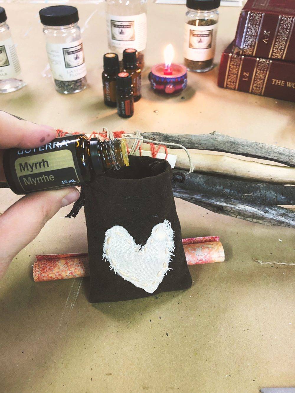 To add a little charm, I used a piece of rafia to wrap a couple cinnamon sticks and a feather to my scroll. For this step, you can use whatever objects you feel suit what you wrote about in your letter. When I was performing this ritual, I felt pulled to include lots of cinnamon. I used the cinnamon sticks here but also used Cinnamon essential oil later in my prayer bag. I was just going with my intuition so I didn’t really know why Cinnamon was drawing me so much until I read about one of the emotional properties of Cinnamon having to do with safety and security.