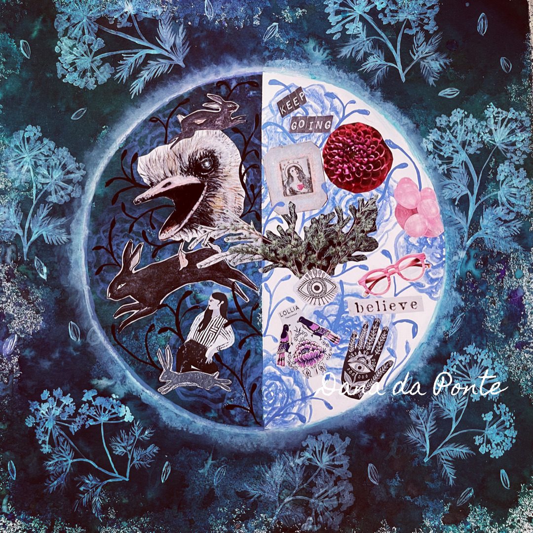 On the first quarter moon the prompt was to show the unhelpful thoughts that swirl around my mind in the shadow of the moon and show the way I prefer to speak to myself in the light side of the moon. As I created my page, I remembered that the mean, judgmental voices are usually just trying to keep me safe but, nevertheless, I made a declaration. I declared that moving forward, I will be governed by a belief in myself and possibilities NOT in my need to play it safe.