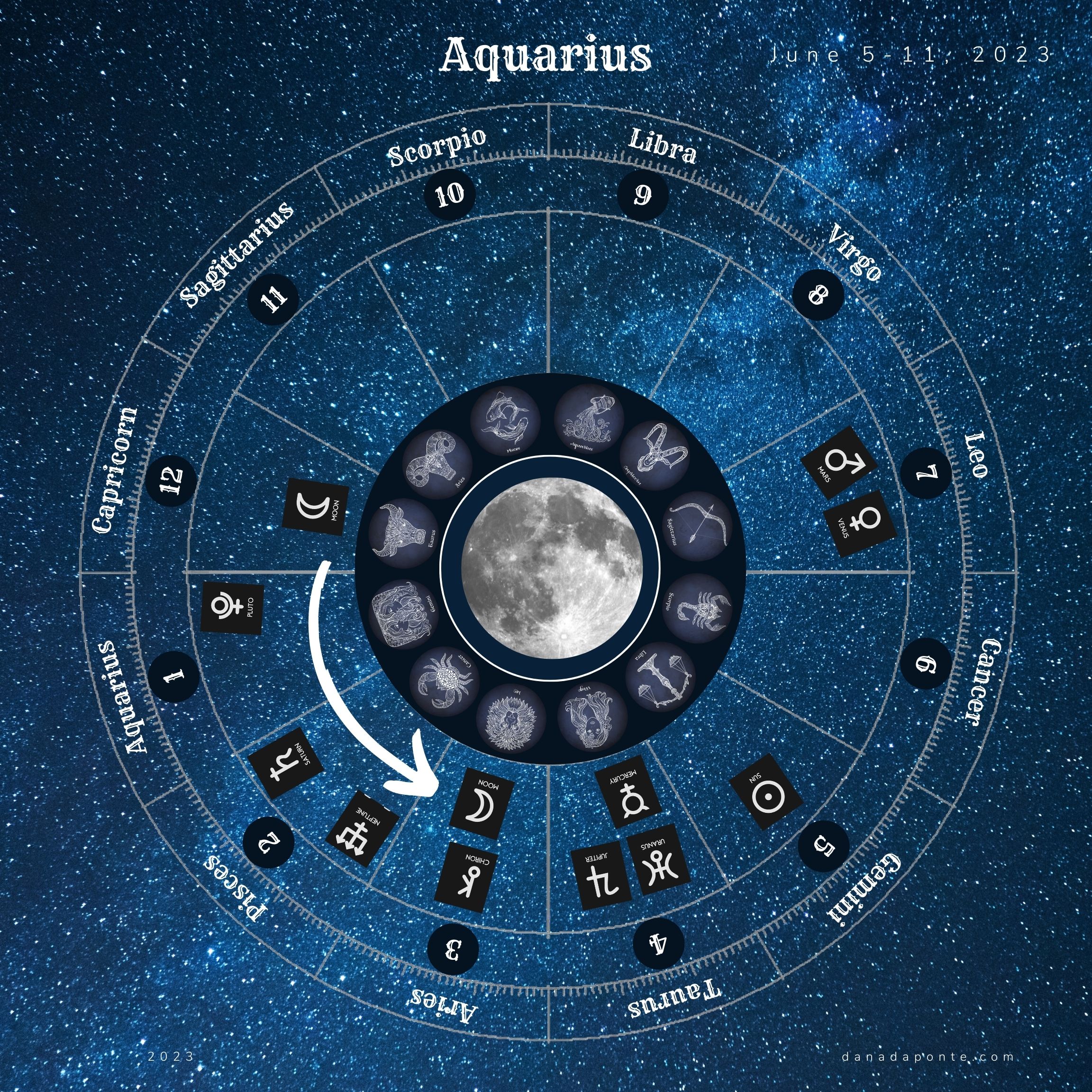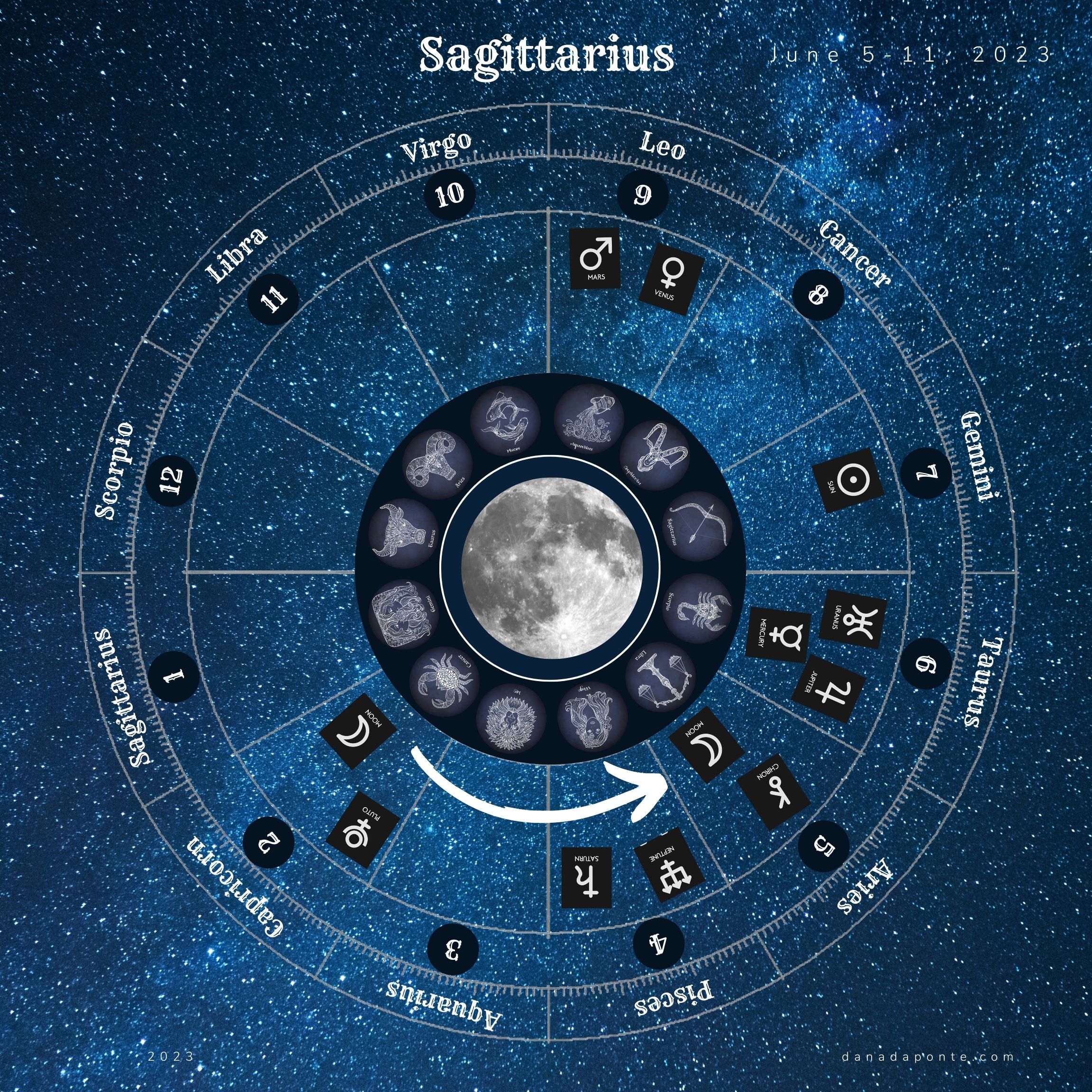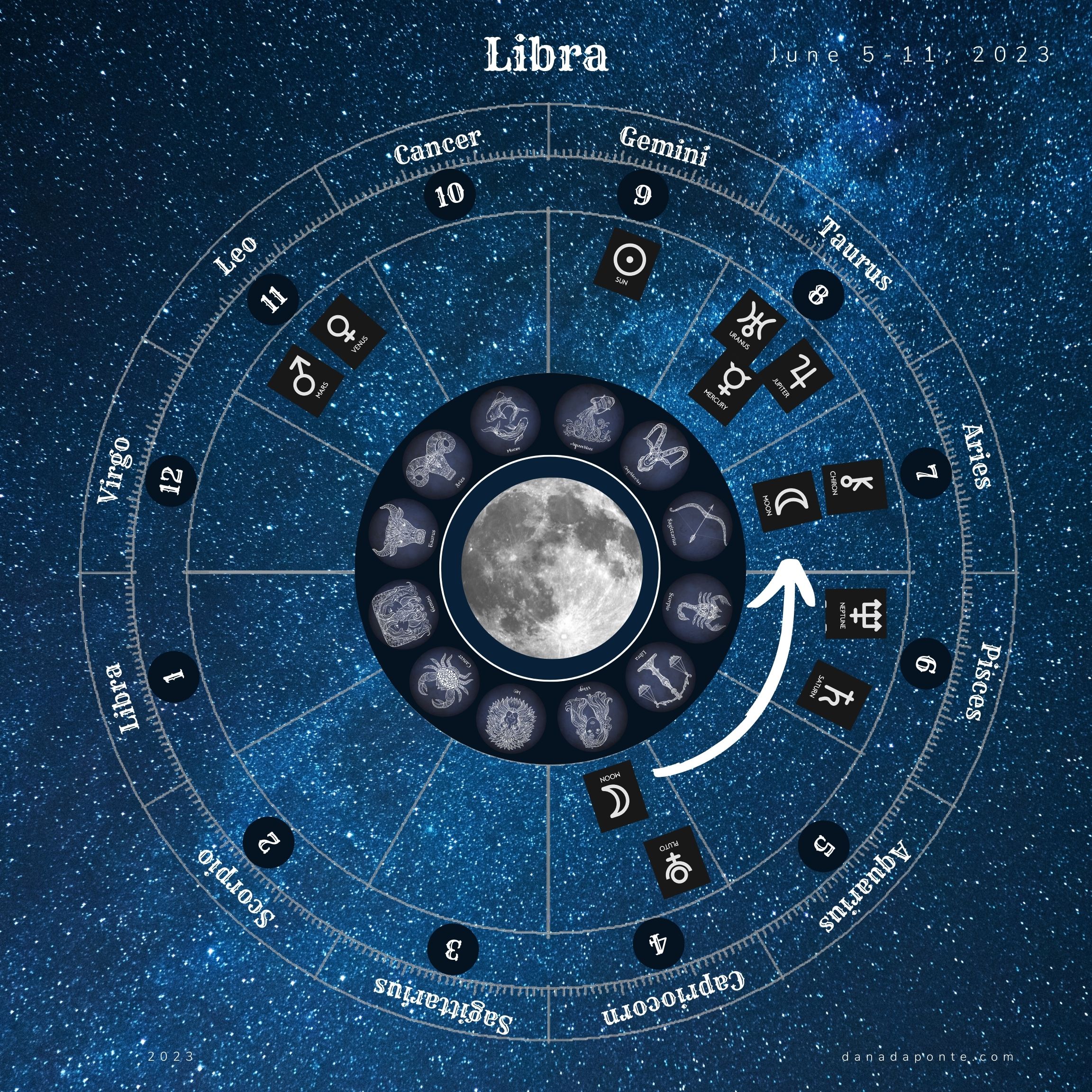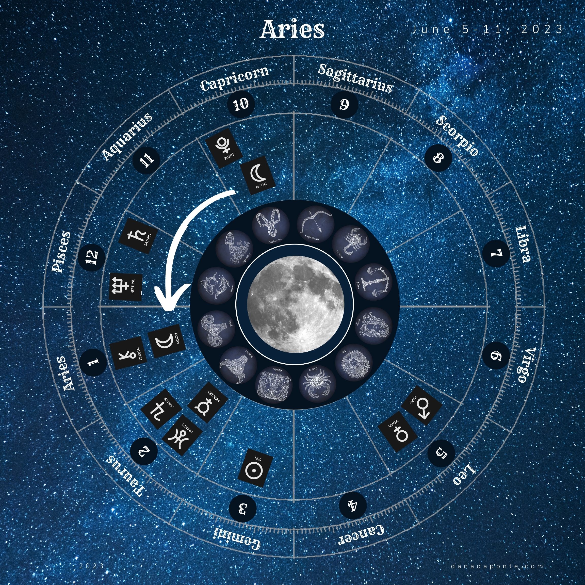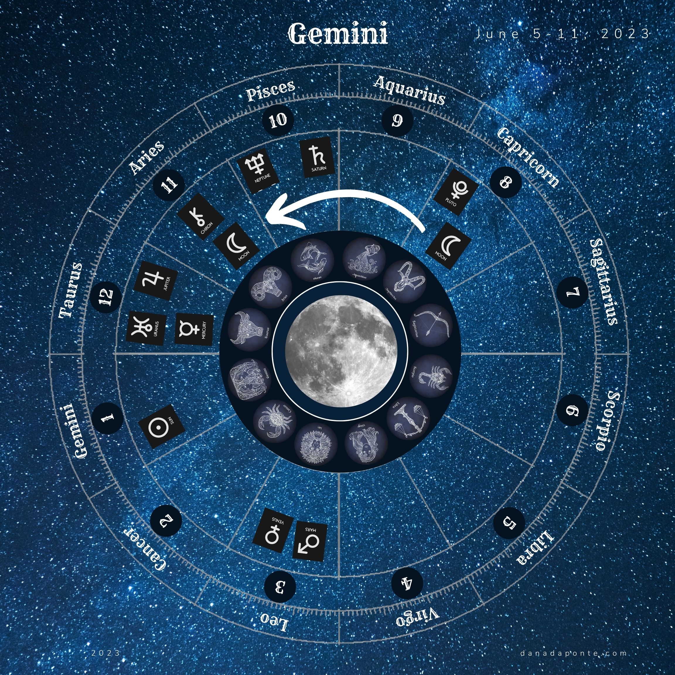 Scroll down to the images that show you the moon this week according to your rising sign again. Find the image with your rising sign then look at the zodiac wheel and find the pie shaped part of the chart that is titled “Gemini”. Next, look at the number below the word “Gemini”. That number represents the astrological house that Gemini takes care of on your birth chart. What astrological house number did you see?