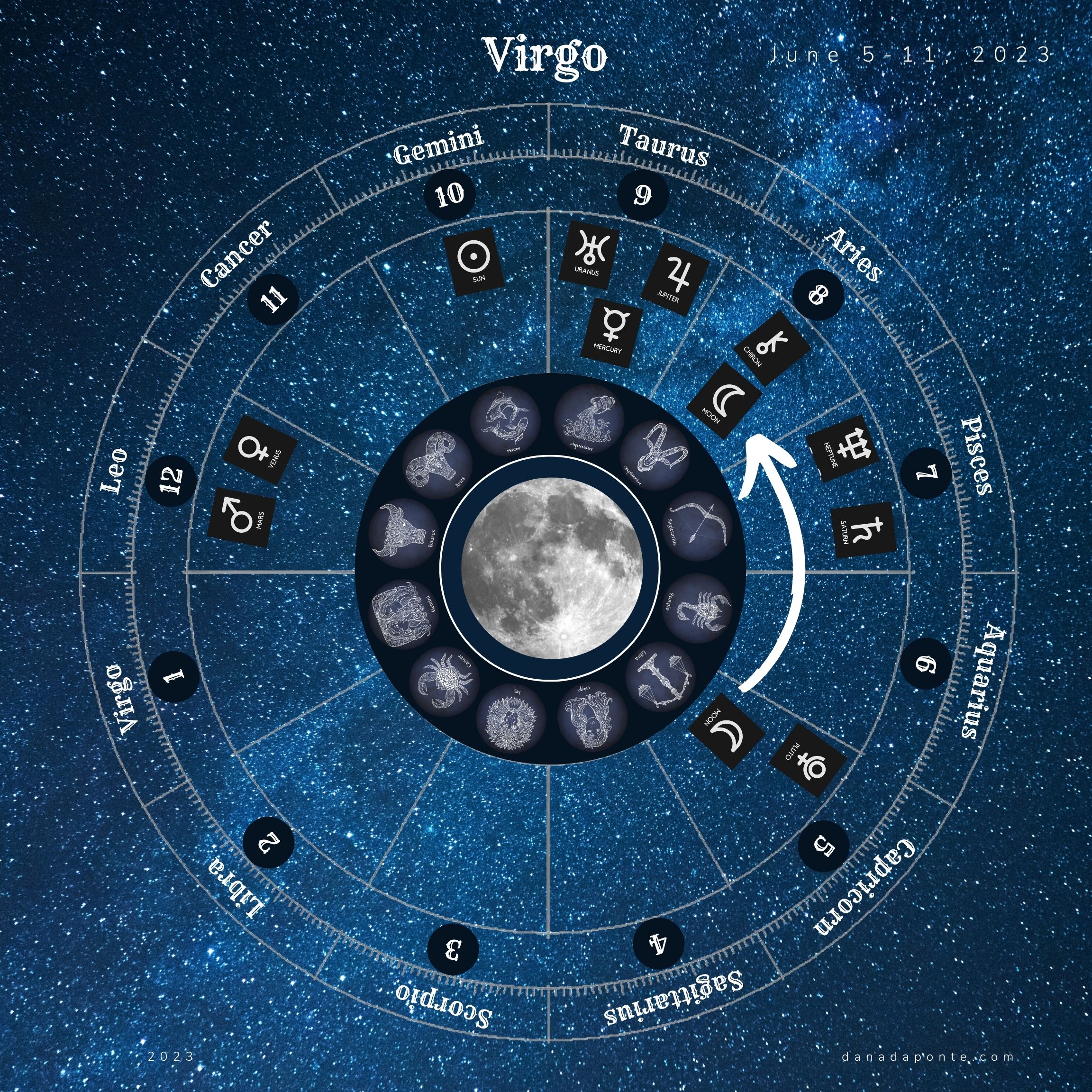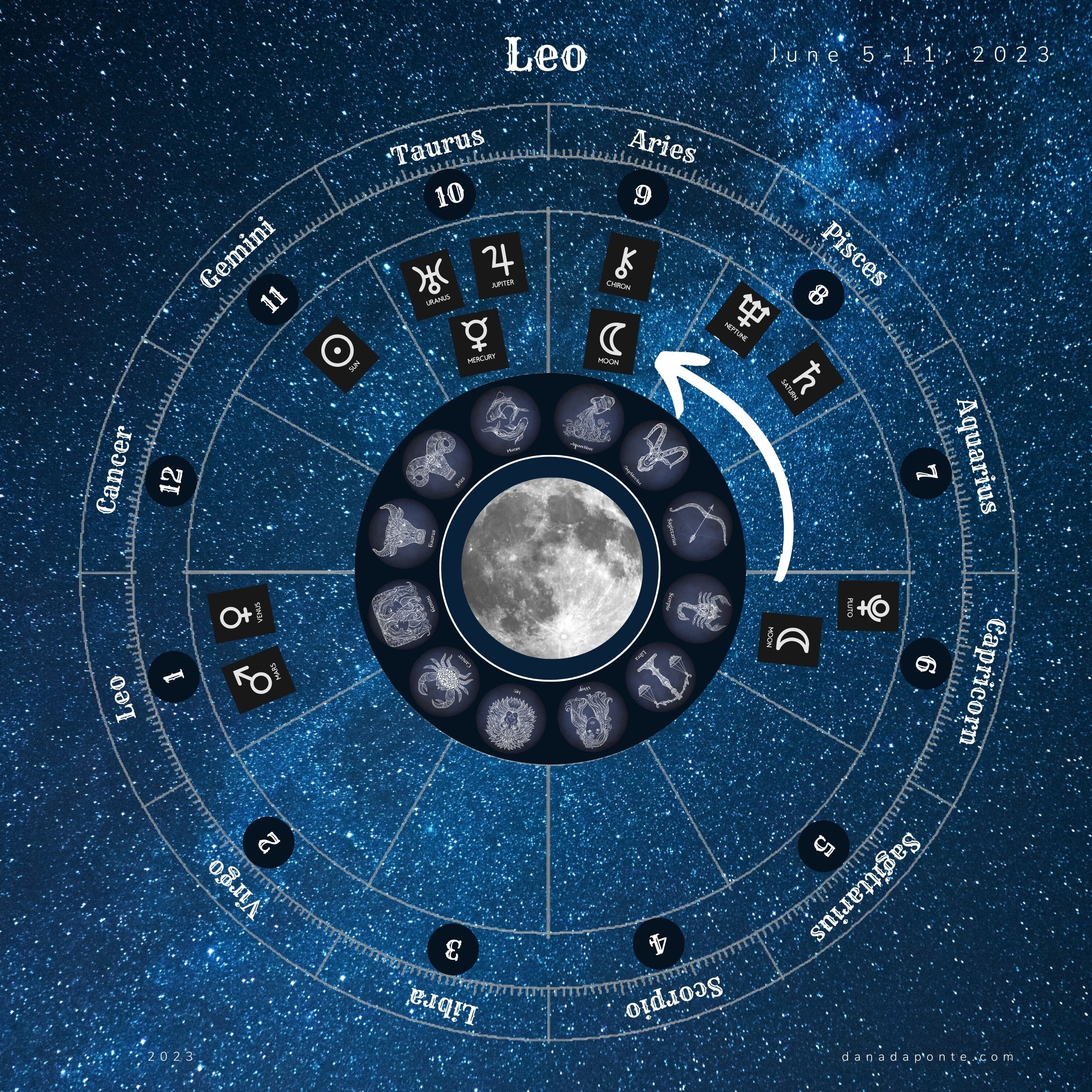 If you want to understand the areas of your life this energy will affect you most, scroll down to the images that show you the moon this week according to your rising sign. Find the image with your rising sign in the title then look at the zodiac wheel and find the pie shaped part of the chart that is titled “Leo”. Next, look at the number below the word “Leo”. That number represents the astrological house that Leo takes care of on your birth chart. What astrological house number do you see?