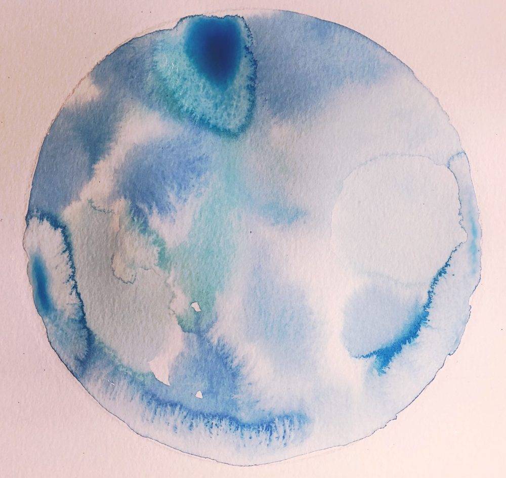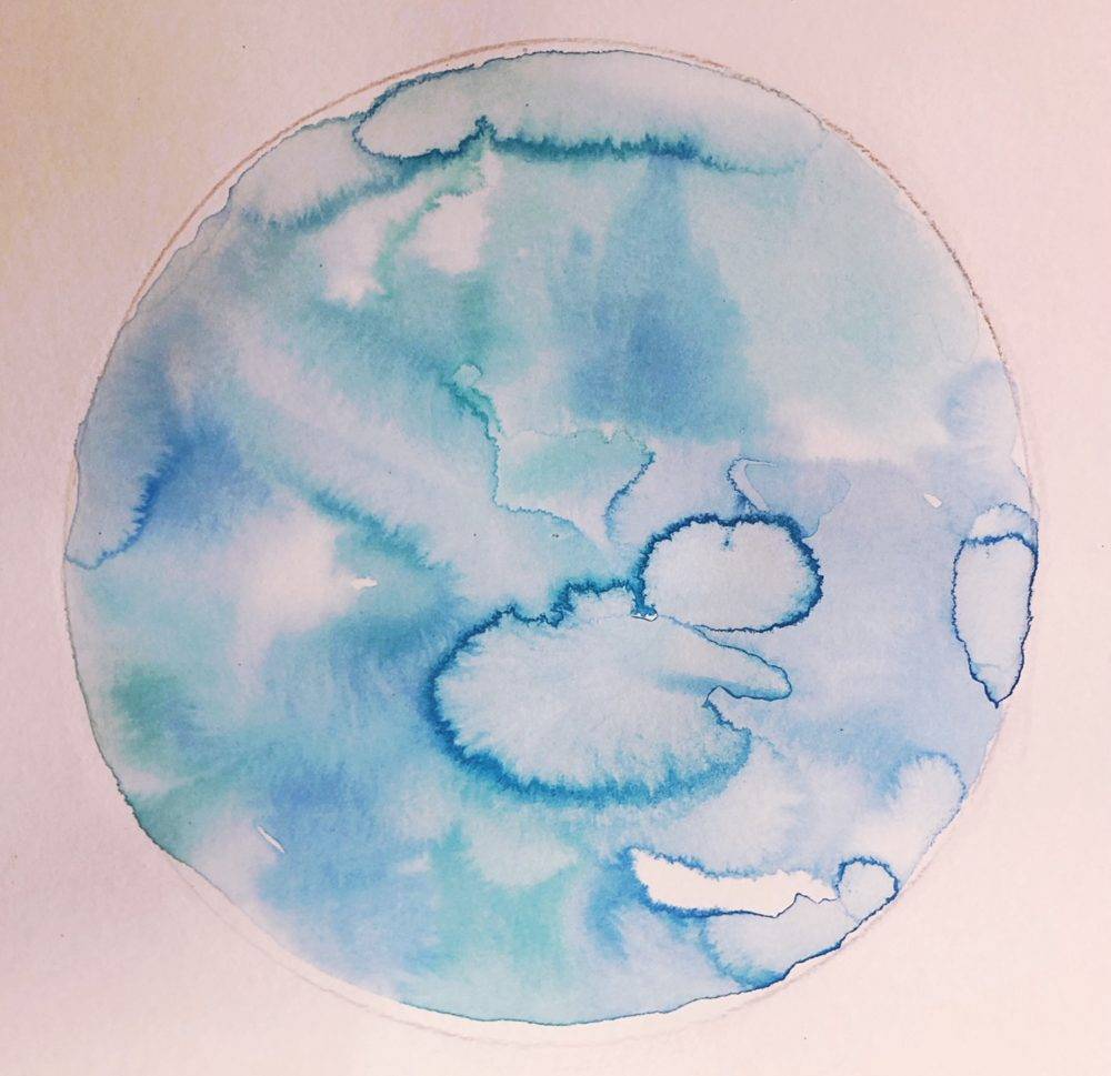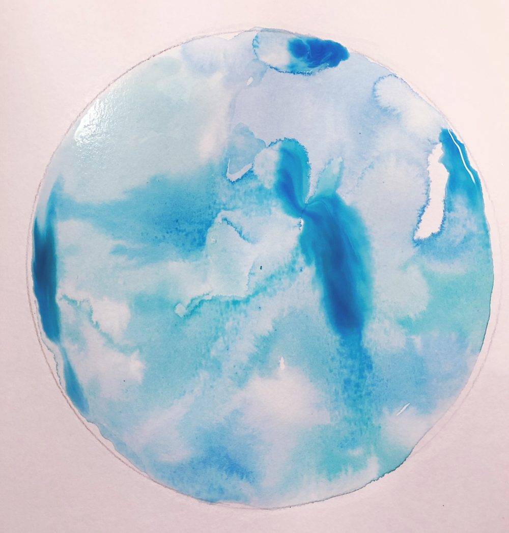 - Repeat dipping the brush into different tones of blue paint and adding the colors and watching them spread until you feel the circle is complete.