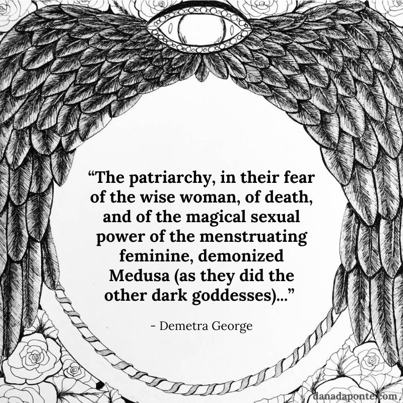 On page 38, Demetra describes how, “As the Goddess became distorted from an image of the compassionate mother, the source and sustainer of all life, into a symbol associated with the forces of darkness and evil, women, her earthly manifestations, were likewise considered impure, evil, and guilty of original sin – people who must be punished. They (too) became the property of their fathers and husbands.”