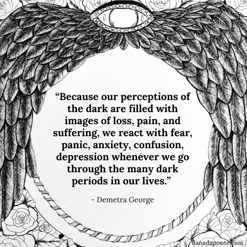 As Demetra explains on page 5, in our culture the dark is seen as terrifying. We associate the dark with loss, abandonment, alienation, failure, isolation, disintegration and madness. In her words, “The dark symbolizes our fears of aging, illness, death, and dying.” It keeps our secret feelings of shame and grief and rage buried deep in the unconscious mind.