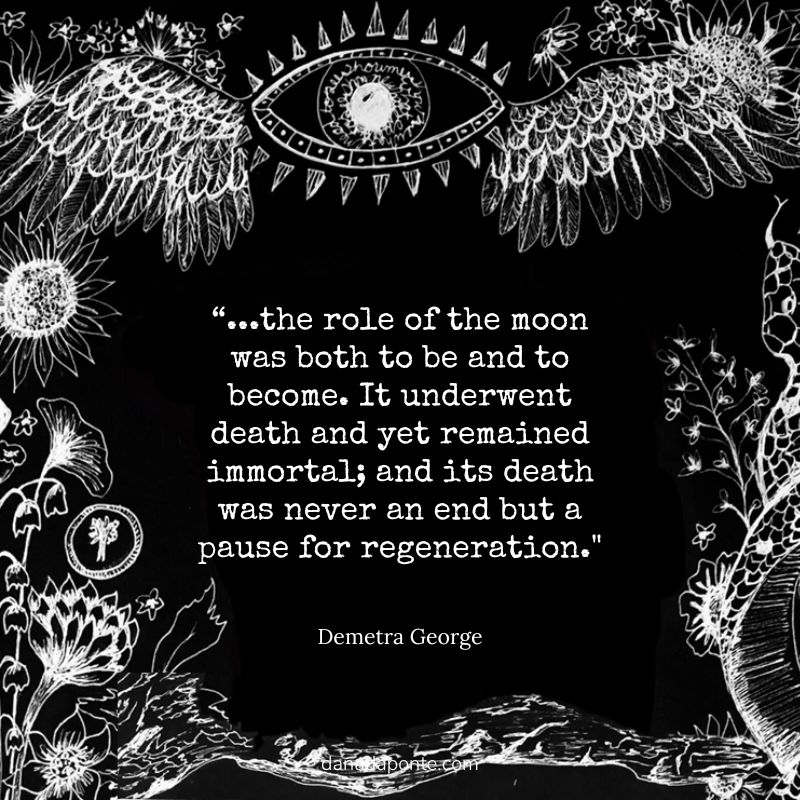 The powers of healing and transformation are hidden in the dark phase of the cycle and in ancient cultures this was represented in the dark phase of the moon. It came to symbolize inspiration, prophecy and divination. On page 13 Demetra says, “the role of the moon was both to be and to become. It underwent death and yet remained immortal; and its death was never an end but a pause for regeneration.”