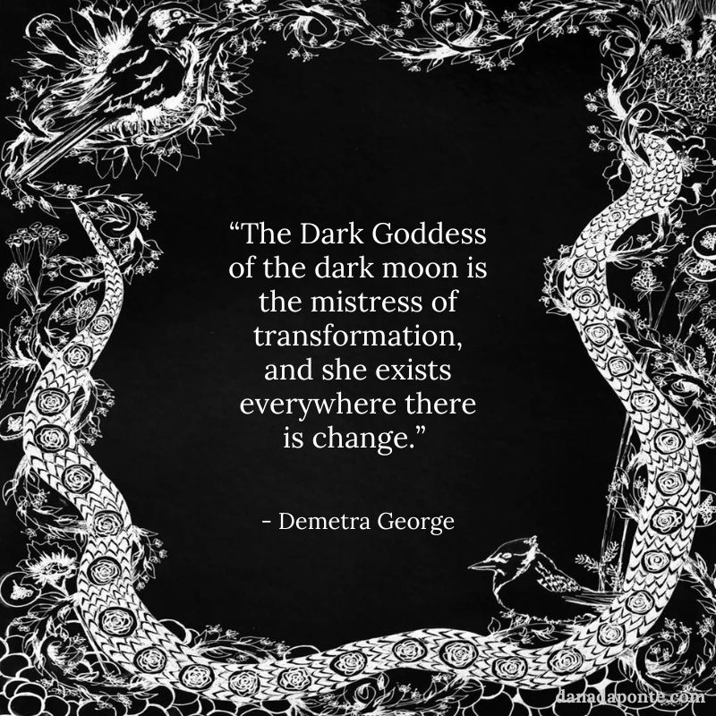 The dark moon phase was the time between death and life. It was a time of darkness, stillness and the unknown but it wasn’t something to be afraid of because it was seen as a deeply sacred time. The Dark Goddess presided over the passage between death and rebirth so she was honored and revered.